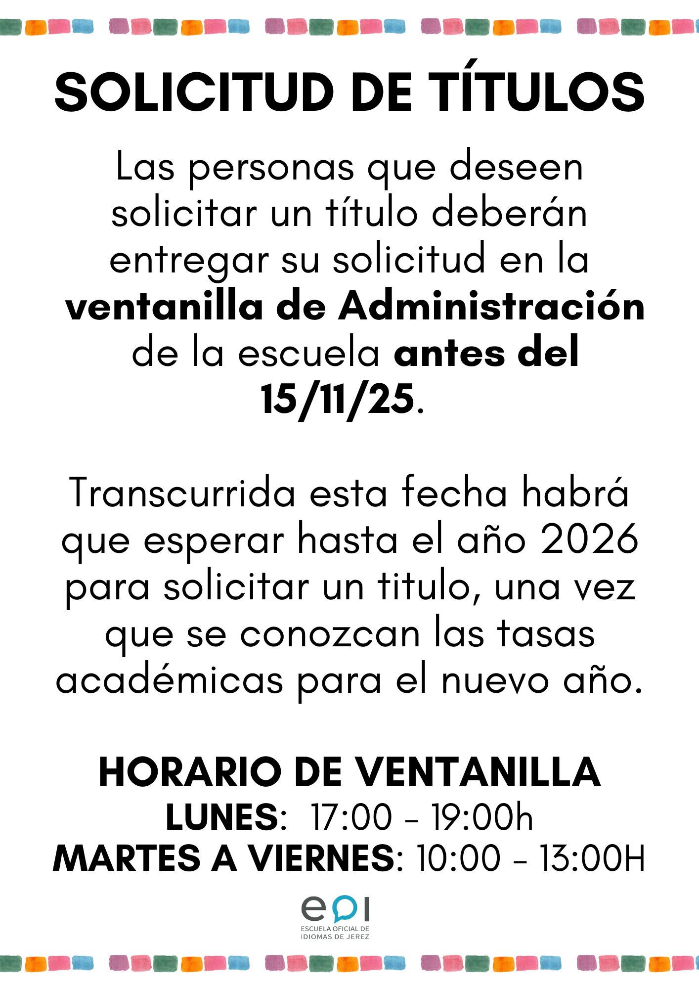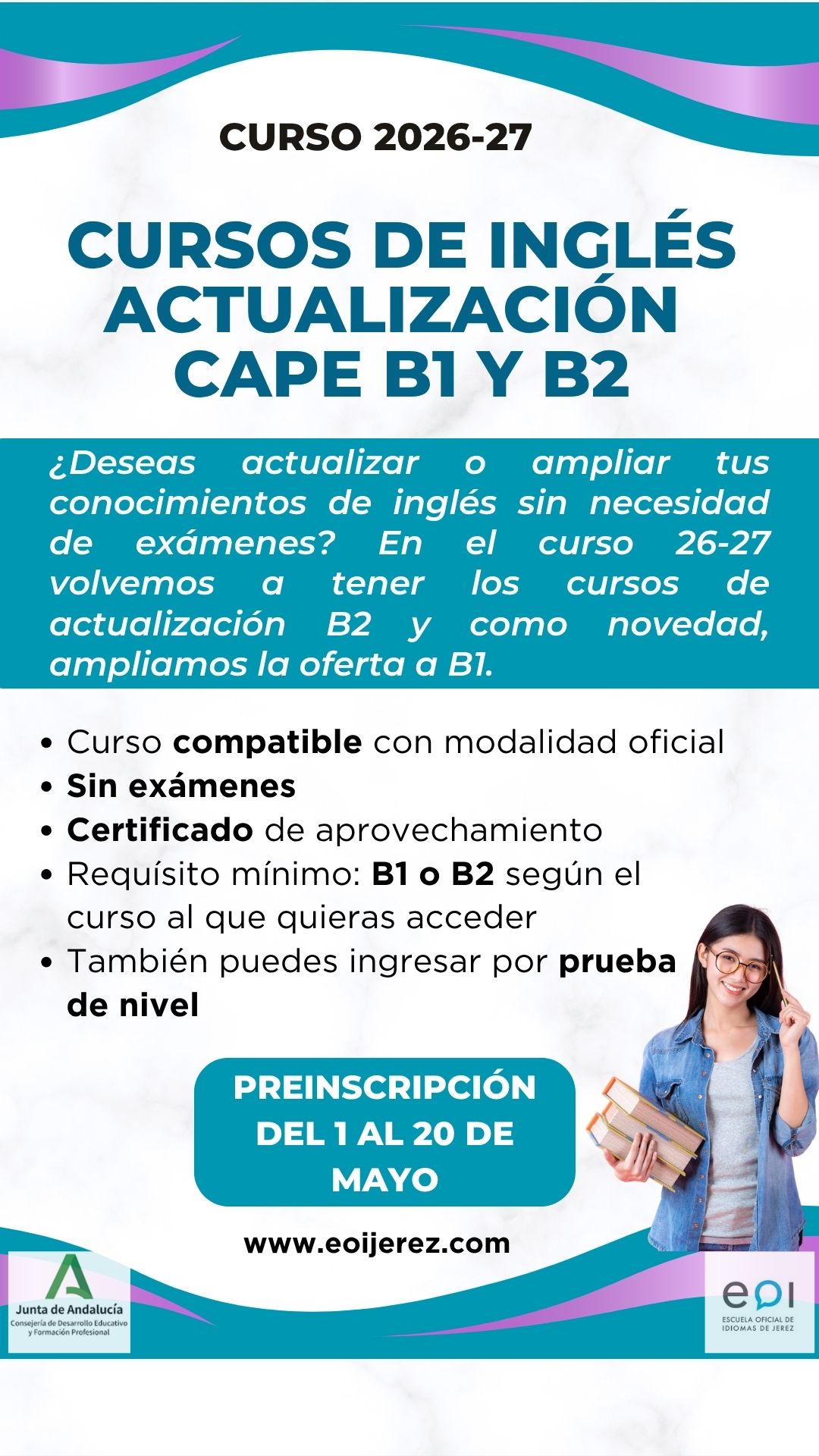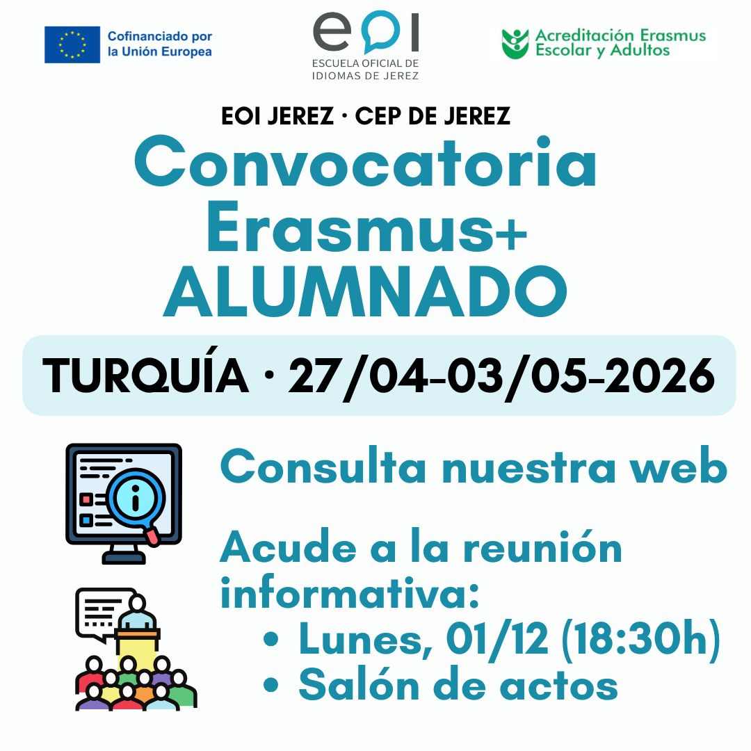 Es un centro oficial dependiente de la Consejería de Desarrollo Educativo y Formación Profesional de la Junta de Andalucía. Las EEOOII pertenecen al grupo de “enseñanzas especiales” y su enseñanza se centra en el estudio y dominio de los idiomas que cada una de ellas imparte. Se trata de una enseñanza no-universitaria de régimen especial. La Escuela de Idiomas de Jerez se creó en Marzo de 1993 como Escuela Municipal de Idiomas. En 1999 paso a formar parte de la red de Escuelas Oficiales de Idiomas de la Junta de Andalucía. Actualmente se imparten en el centro cuatro idiomas: Inglés, Francés y Alemán en las modalidades presencial y semipresencial así como Español como lengua extranjera en la modalidad presencial. Asimismo, se imparten Cursos de Actualización Lingüística para profesores, dentro de Plan de Fomento de Plurilingüismo y Cursos de Actualización, Perfeccionamiento y Especialización de Competencias en Idiomas (CAPE) . Estamos muy cerca del centro histórico de Jerez de la Frontera, en la calle Ponce 10.